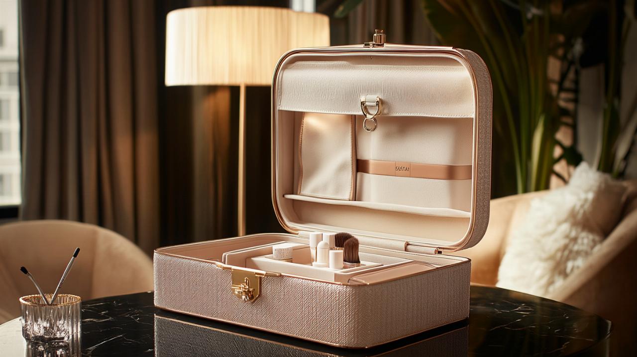 La elección de materiales en la fabricación de este estuche refleja un compromiso con la durabilidad y la sofisticación. El exterior resistente no solo protege el contenido, sino que también proyecta una imagen de profesionalismo y buen gusto. En el interior, los compartimentos están diseñados estratégicamente para maximizar el espacio disponible y facilitar el acceso rápido a cada producto. La transparencia de algunas secciones internas permite visualizar el contenido sin necesidad de abrir completamente el tocador, ahorrando tiempo en esos momentos en los que cada minuto cuenta antes de un vuelo o una reunión importante.